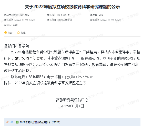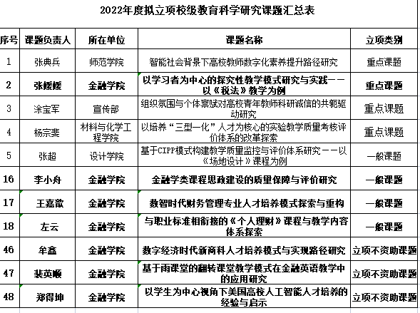 2022年11月4日,经校内外专家评审,学校研究,学校公布了2022年校级教育科学研究课题立项结果,确定50项予以立项,其中重点课题4项,一般课题40项。我院张媛媛副教授和李小舟、王嘉歆、左云、牟鑫、裴英顺、郑得坤六位年轻博士教师分别获得重点和一般课题等共计7项。