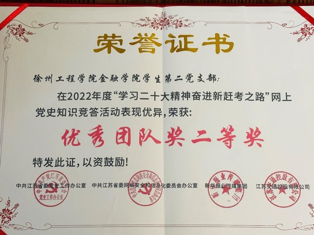 7月28日下午,由江苏省委党史工办联合江苏省委网信办、新华报业传媒集团、江苏交通控股有限公司组织开展的“学习党的二十大精神、奋进新赶考之路”网上党史知识竞答颁奖典礼在“红军小镇”——如皋市江安镇举行。全省共有10家单位荣获优秀团队奖,11家单位获优秀组织奖,10位党员选手荣获“学习标兵”称号。7790必发集团学生第二党支部荣获优秀团队奖二等奖。